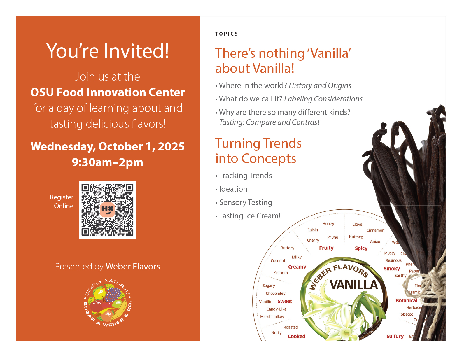 Weber Flavors will visit the OSU Food Innovation Center on October 1st for a day of learning and tasting flavors, with students and educators alike. Topics to be covered include the wide world of Vanilla, and how new flavors are created and developed.